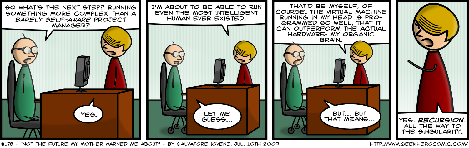 Geek Hero is a comic about Randall (friends call him Randie), a hardcore geek with the sweetest heart. Randall is an Open Source developer for a large company, a Debian user and sometimes doesn't relate well with his peers! Geek Hero is translated to German at Linux Community.